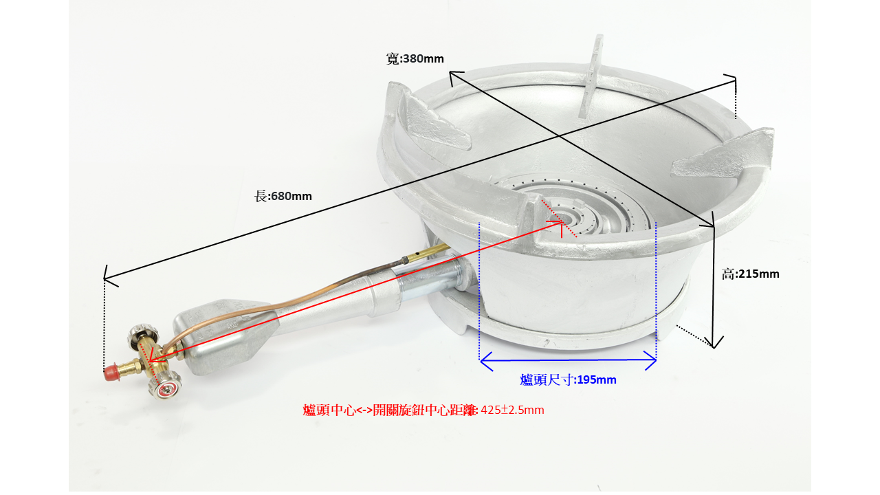 Dimensions, including the big middle and upper rack (length x width x height): 680mm x 380mm x 215mm【picture 1】 Dimensions, only stove and bottom rack (length x width x height): 590mm x 240mm x 90mm【picture 2】 Dimensions, only stove and big bottom rack (length x width x height): 610mm x 280mm x 115mm【picture 3】 Burner dimensions: 8 inches (195 mm diameter) Distance from the center of the burner to the center of the switch knob: 425±2.5mm 8B detachable middle and upper rack dimensions: 380 mm diameter, 215 mm height ★Dimension Diagram
