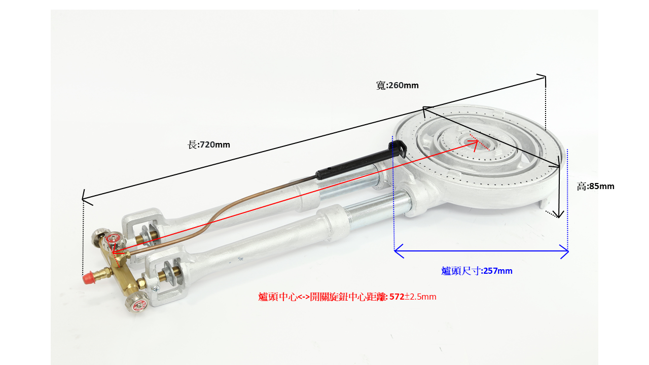 Distance from the center of the burner to the center of the switch knob: 572±2.5mm
